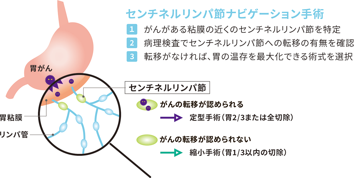 センチネルリンパ節ナビゲーション手術は、転移の有無を把握することで、切除範囲を最低限にし、できるだけ胃を温存しようとするものです。