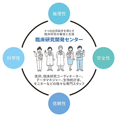 また、当院の臨床研究開発センターは、治験のほか、医師や研究者が行う臨床研究についても、計画段階から終了まで適切に遂行されるようサポートしています。
